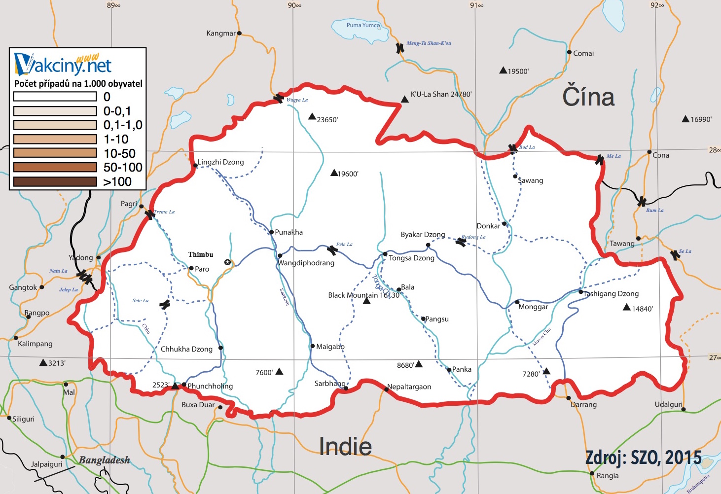 Země a oblasti považované za rizikové (od roku 2011, dle SZO: Wkly Epidemiol Rec. 2011 Sep 9;86(37):401-11.):