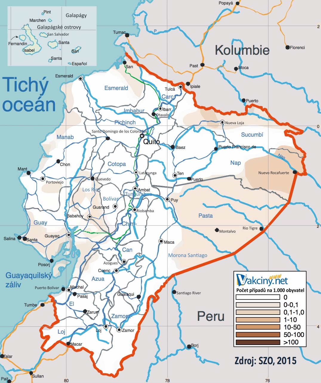 Filarióza, onchocerkóza - jednotlivá ložiska na severozápadě (Esmeraldas)- východní údolí And