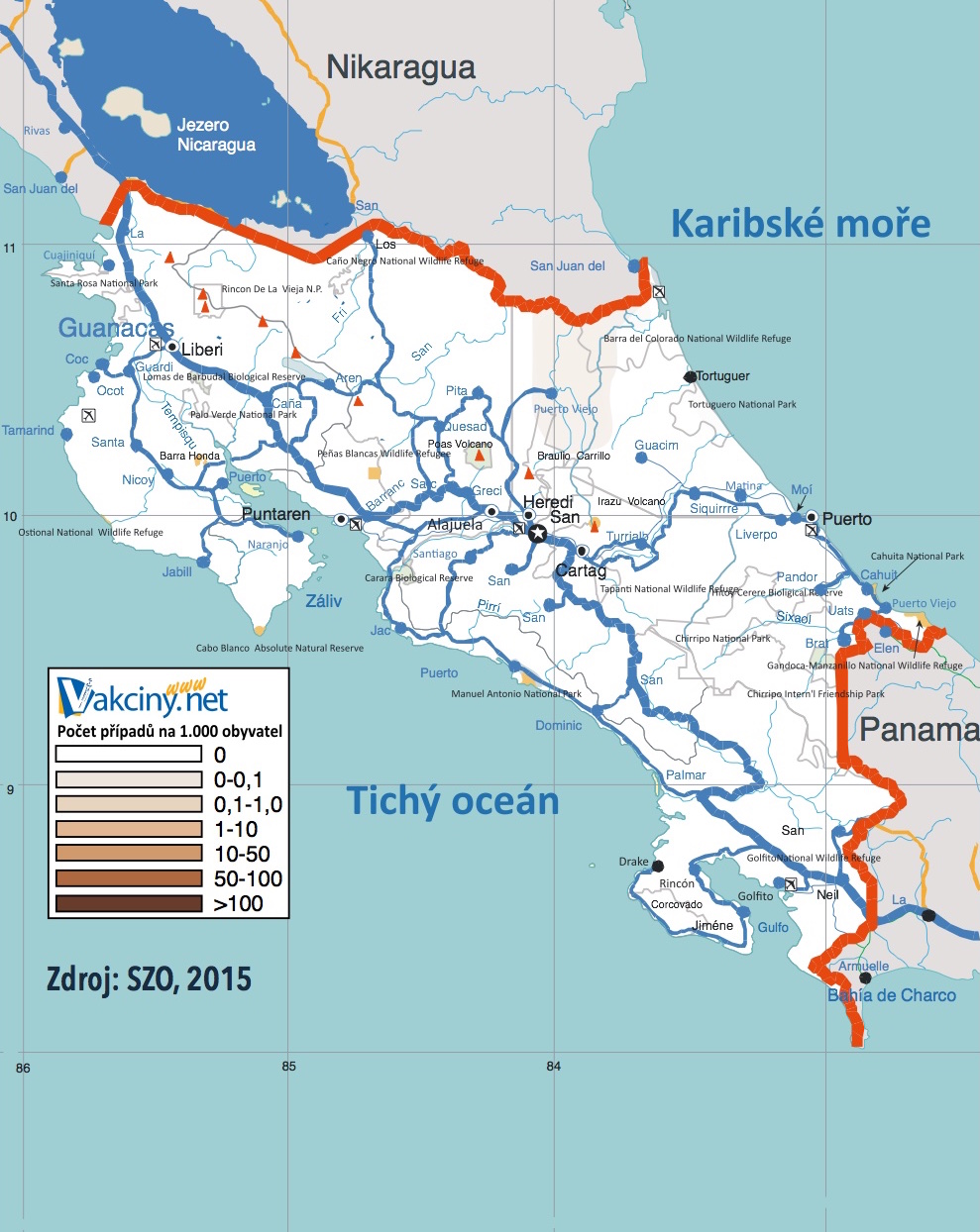 Země a oblasti považované za rizikové (od roku 2011, dle SZO: Wkly Epidemiol Rec. 2011 Sep 9;86(37):401-11.):