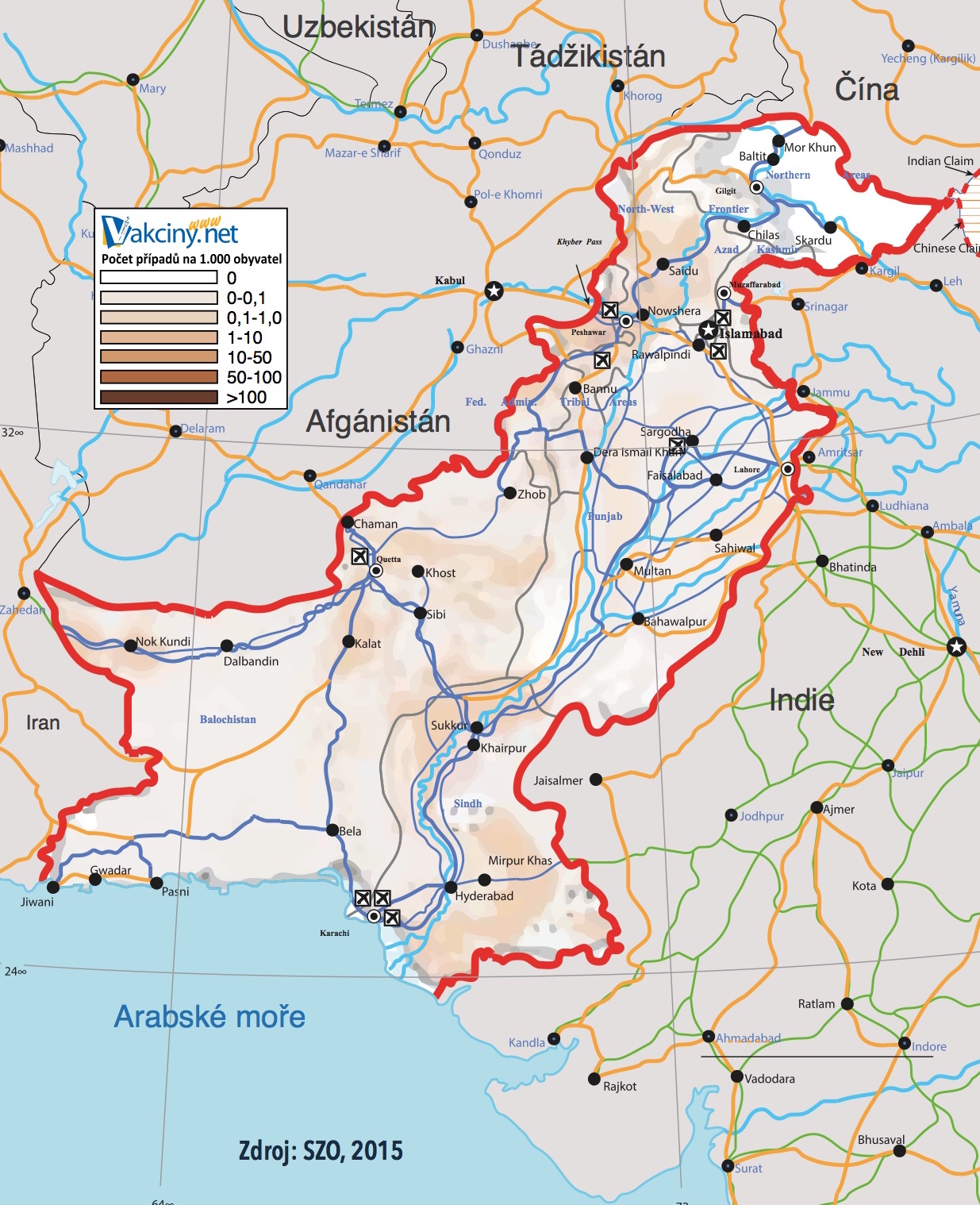 Očkování se doporučuje cestovatelům pobývajícím v odlehlých venkovských oblastech nebo žijících a pracujících poblíž rýžových polí na venkově nebo příměstských oblastech, kde existuje zvýšená pravděpodobnost přenosu japonské encefalitidy komáry. Očkuje se buď třemi (0-7-30 dní) nebo dvěma (0-28 dní) dávkami podle typu vakcíny a nejpozději se očkování zahajuje jeden měsíc před odjezdem. Případy byly hlášeny v údolí Indus a oblasti Karachi. Období přenosu: červen až říjen.