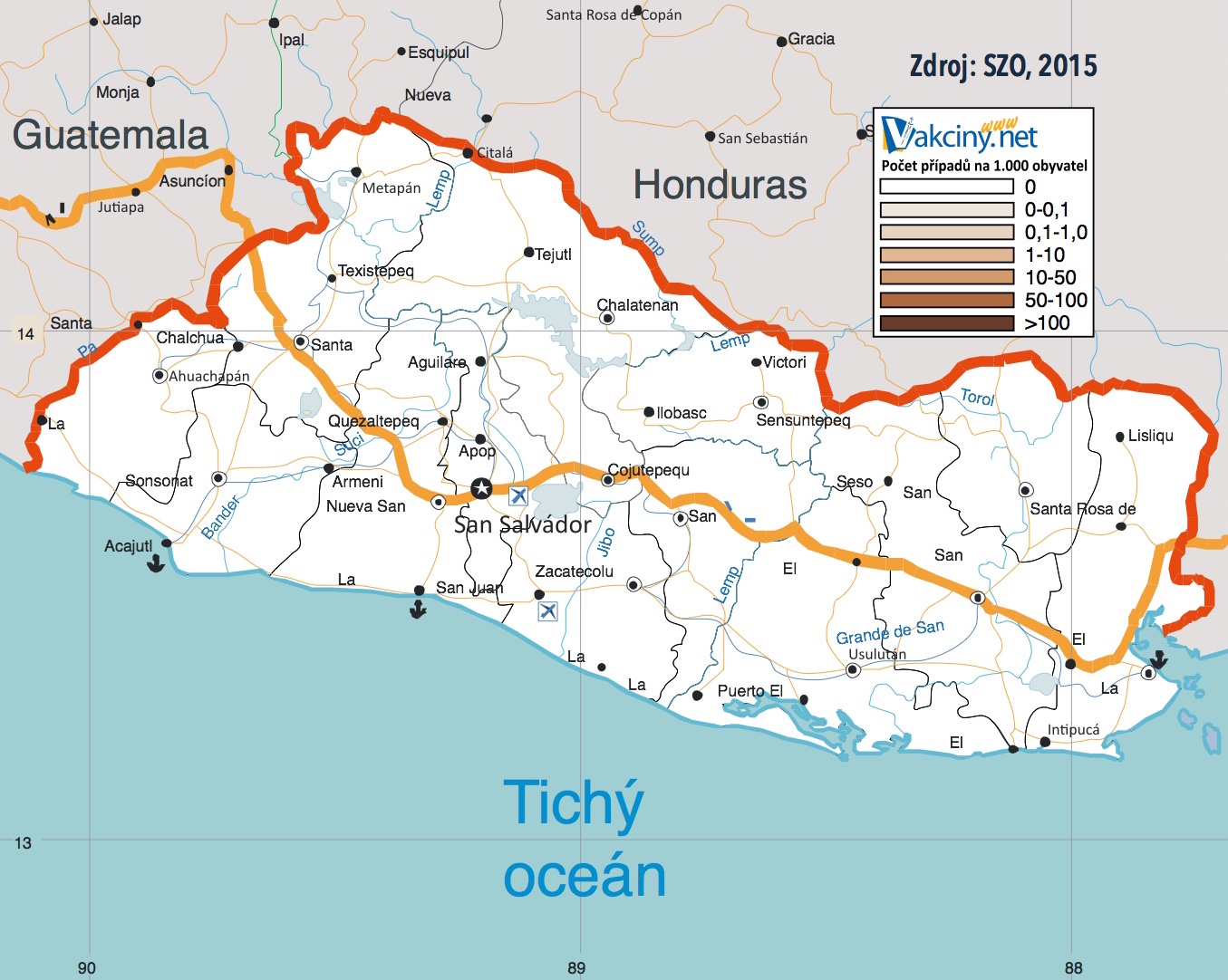 Země a oblasti považované za rizikové (od roku 2011, dle SZO: Wkly Epidemiol Rec. 2011 Sep 9;86(37):401-11.):